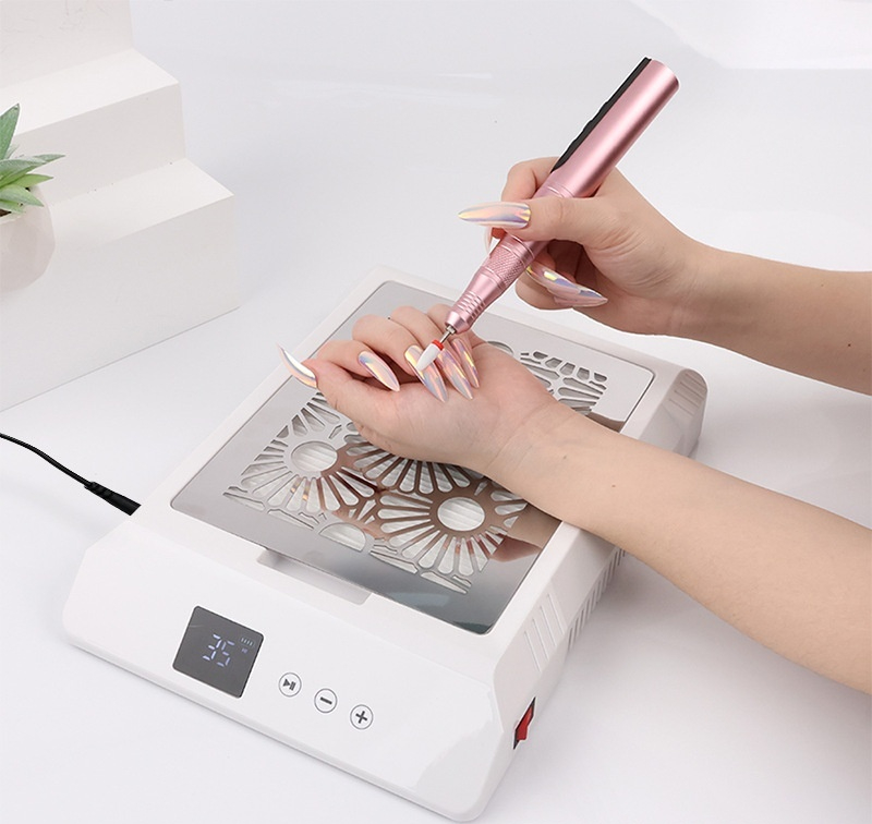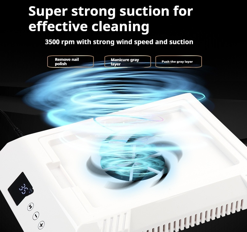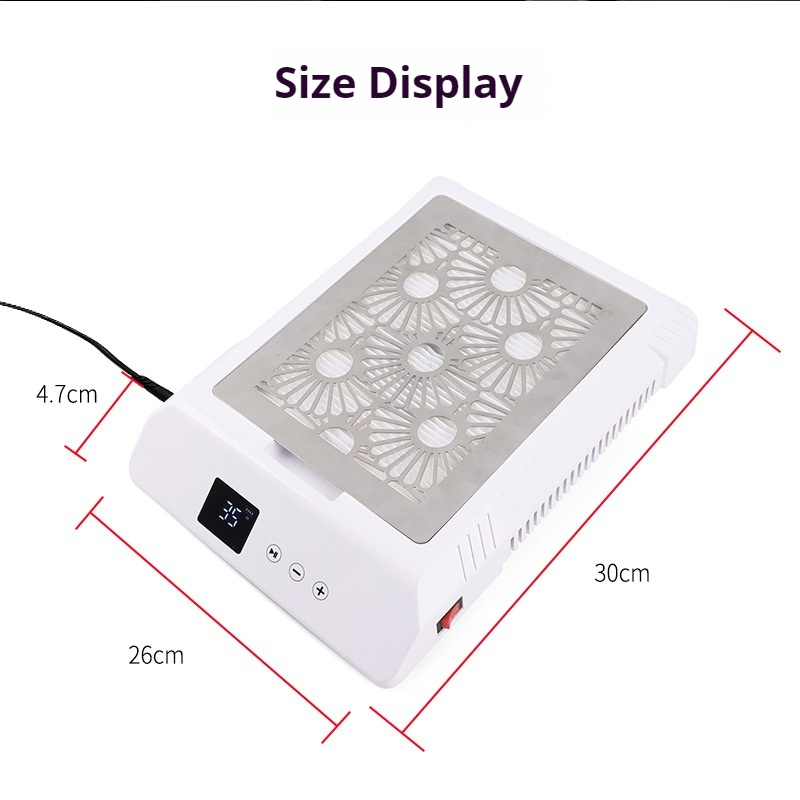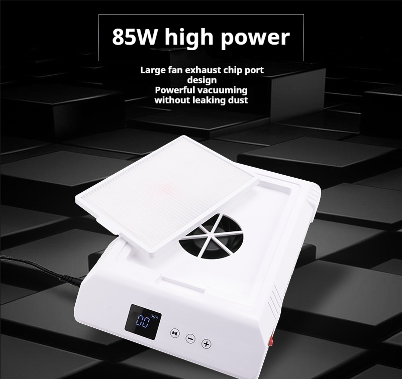 Equipped with an 85W powerful motor, it provides a suction capacity of 69.69 cubic feet, effectively collecting nail dust to prevent it from spreading in the air. The compact dimensions of 30CM x 26CM x 4.7CM make it perfect for desktop use, while the maximum noise level of 53.5 dB ensures a quiet operation. Available in SN321C White and SN321C Black, it suits any modern workspace aesthetic.